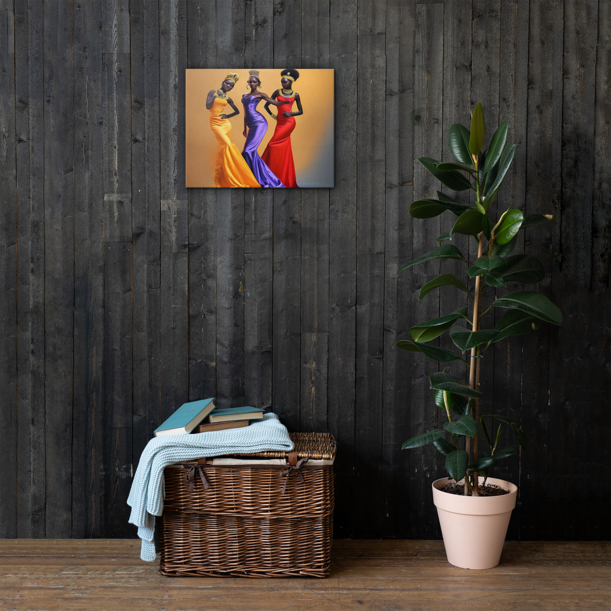 This stunning digital artwork features three young African princesses dressed in long, flowing dresses in striking shades of yellow, purple, and red. Each princess is adorned with a beautiful crown, adding a regal touch to the composition. The intricate details and vibrant colors of the artwork create a captivating scene that celebrates the beauty and strength of African culture. Printed on high-quality materials, this artwork is the perfect addition to any space, adding a touch of elegance and cultural richness to any room.