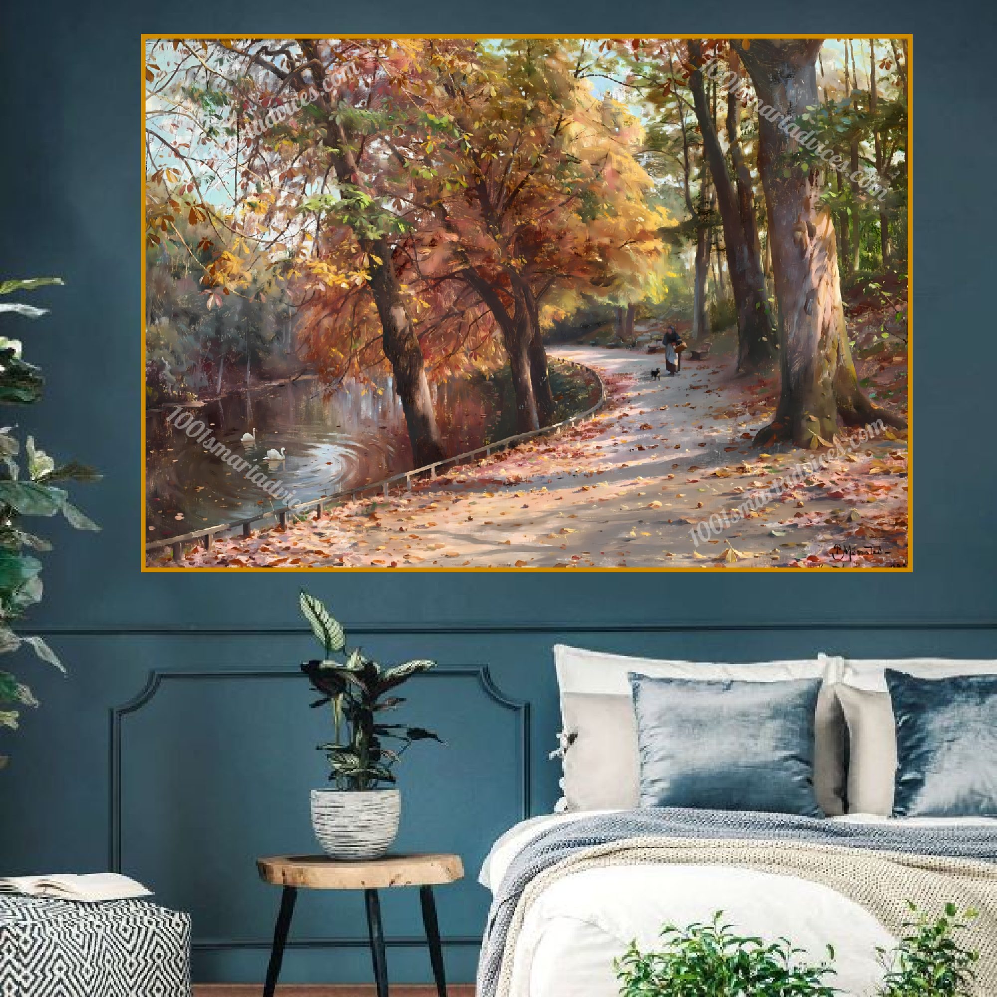 The elderly woman, walking slowly through the autumn woods, embodies patience and presence. She is not rushing; she is looking—truly looking—at the ground beneath her feet, noticing what others might overlook. Her small dog reminds us of the simple loyalties that give life warmth. The swans, undisturbed, move through the water with a grace that needs no audience.