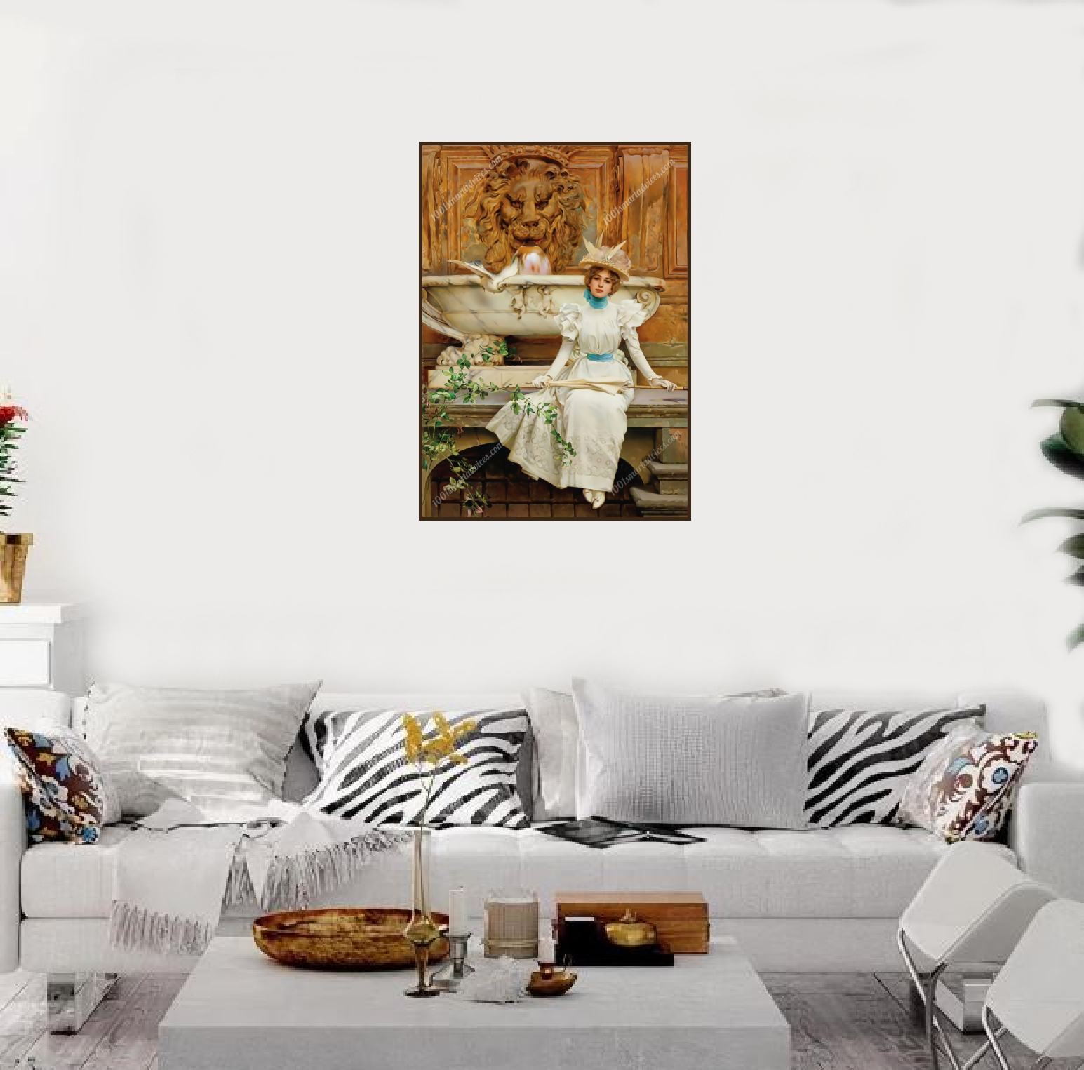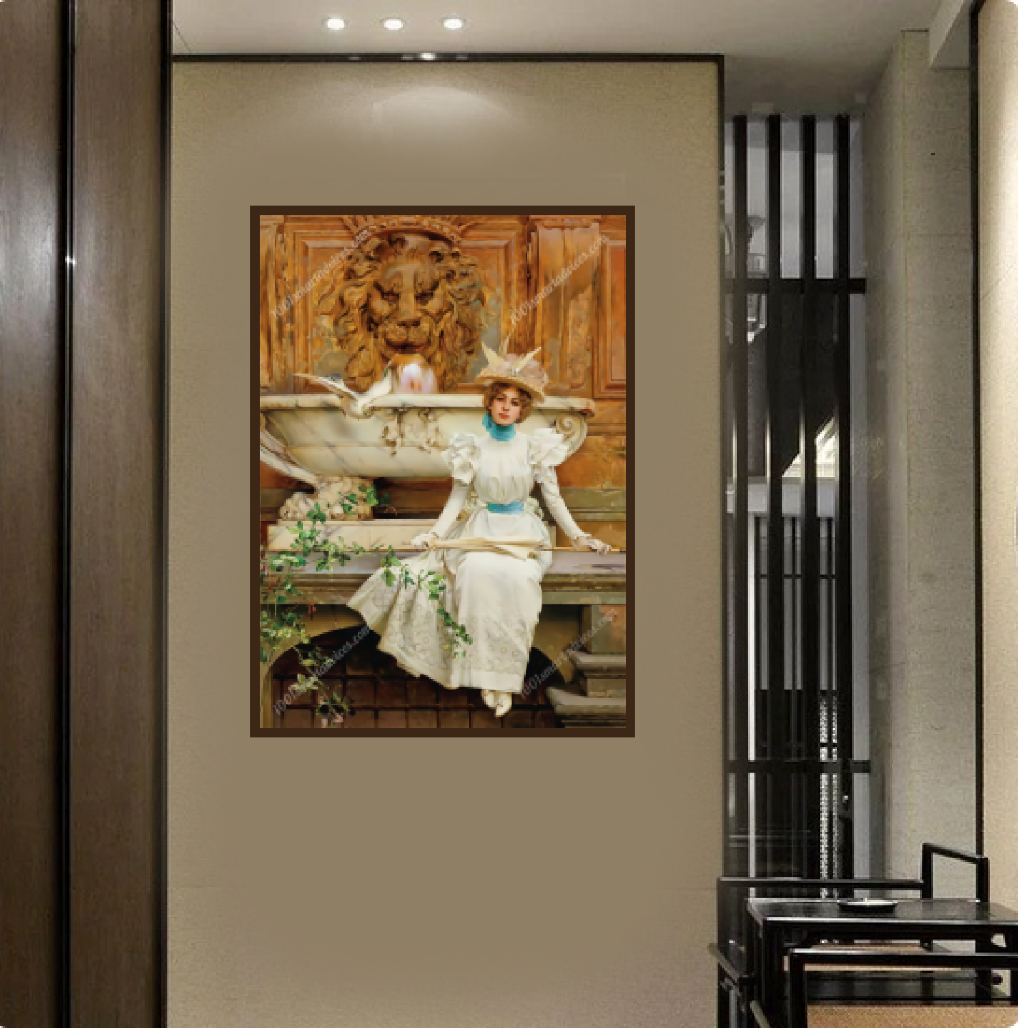 This digital rendition of ‘At the Fountain’ is not merely a replication but an homage that seeks to capture the spirit of Corcos’ original masterpiece. Step into this timeless moment where the elegance of the past is revitalized through modern innovation, inviting viewers to immerse themselves in the captivating allure of refined society.