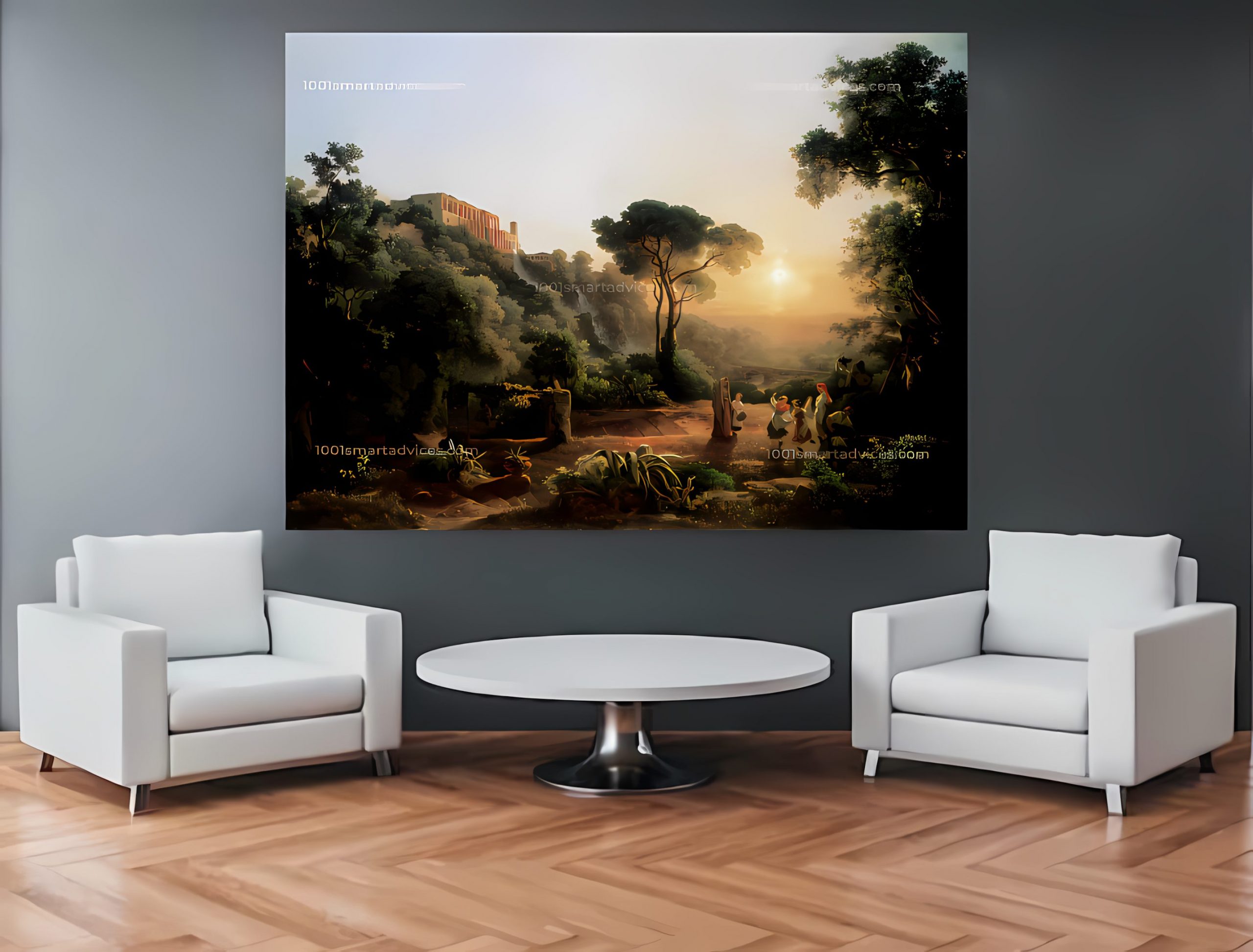 “Landscape near Tivoli with Vintage Scenes” by Károly Markó is a breathtaking painting that transports viewers to the serene and idyllic countryside near Tivoli, Italy. Painted in the mid-19th century, this oil on canvas masterpiece showcases Markó’s exceptional skill in capturing the beauty of nature and the charm of rustic life.